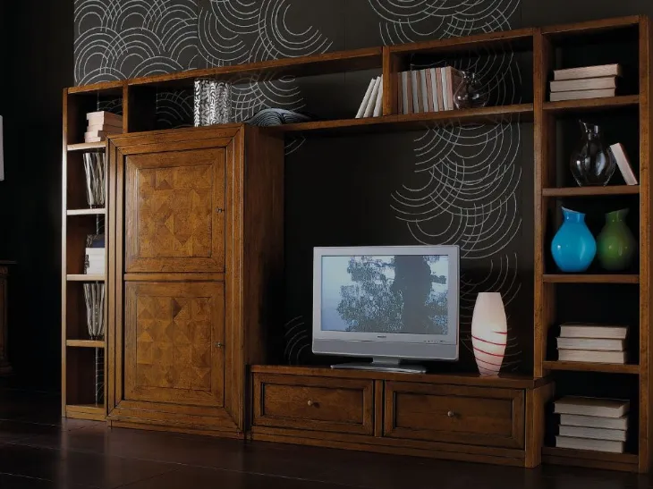 La Parete Attrezzata Ca' Venier CV1011 di Cantiero nell'immagine, realizzata in legno, risolve le più personali esigenze abitative di spazio e stile senza rinunciare alla ricerca stilistica. Anche in un living non troppo grande, questo tipo di arredo riesce a organizzare al meglio gli spazi sfruttando bene ogni angolo e assicurando componibilità su misura tipica delle soluzioni classiche. Se cerchi arredi salvaspazio e realizzabili su misura, contattaci e scopri di più sull'Arredamento Casa dei migliori produttori. Questa soluzione costituisce tutta la qualità che il marchio assicura grazie a pluriennale professionalità e grande passione nel campo dell'arredo e del design. Un po’ librerie, un po’ mobili contenitori ed espositori: le Pareti Attrezzate sono ideali per ottimizzare uno spazio dinamico e operativo.